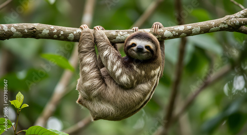Obraz premium Adorable Sloth Hanging Upside Down on a Tree Branch in Lush Rainforest