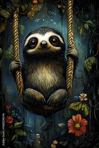© Kobby, Obraz premium Adorable sloth on a swing amidst lush jungle flora.