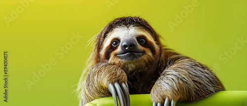 Naklejka premium Adorable sloth resting, lime green gradient background, ample copy space,...