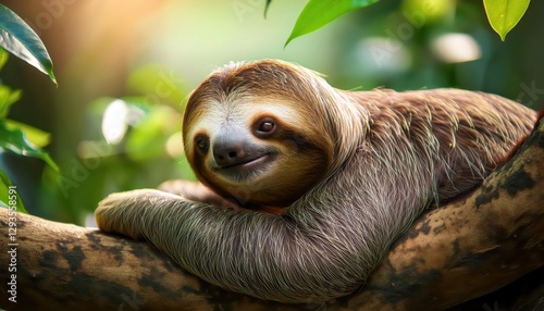 Fototapeta premium Adorable Sloth Smiling on Tree Branch in Lush Vibrant Natural Environment...