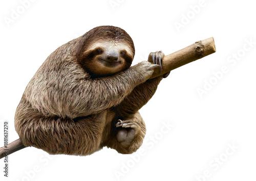 © Hanoi .s, Obraz premium Adorable sloth smiling while gripping a stick isolated on transparent or white background