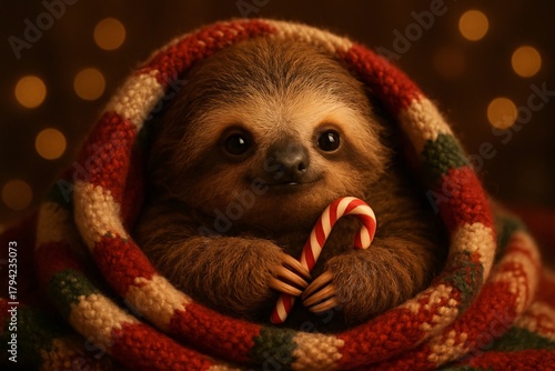 Fototapeta premium Adorable Sloth Wrapped in a Cozy Christmas Blanket Holding a Candy Cane