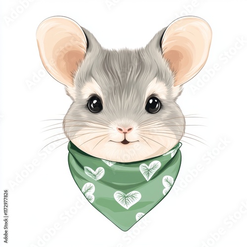 © Zabolotna_Art, Obraz premium Adorable Small Chinchilla Wearing Vibrant Green Heart Bandana, Cozy and Cute Animal Pet
