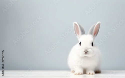 © lanters_fla, Obraz premium Adorable smiling rabbit isolated with copy space for Easter gray background. Fluffy bunny, animal pet.