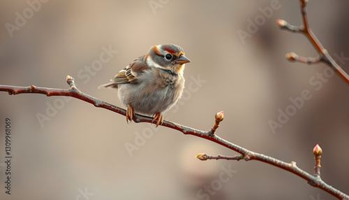 Fototapeta premium Adorable Sparrow Perched on a Budding Branch in a Soft Neutral Background