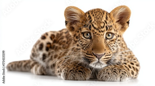 Fototapeta premium Adorable spotted leopard cub with bright amber eyes lying on white background looking directly at camera showing beautiful rosette pattern fur and whiskers