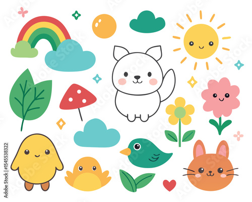 Naklejka premium Adorable springtime vector illustration featuring cheerful animals rainbows and nature elements.
