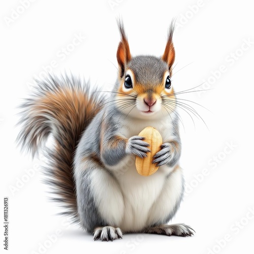 © Waqas, Fototapeta premium Adorable squirrel sitting upright and holding a peanut, isolated on white background, showcasing its fluffy tail and expressive eyes
