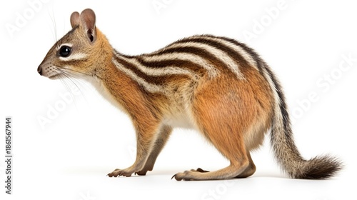 © titin, Obraz premium Adorable striped chipmunk standing alert on a white background with distinctive dorsal stripes