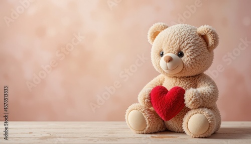 Obraz premium Adorable stuffed bear holding a red heart on a wooden surface