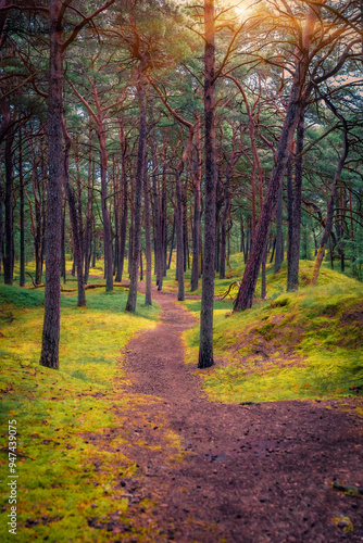 © Andrew Mayovskyy, Obraz premium Adorable summer sunrise in pine forest in Rugen island. Splendid morning view of pathway in woodland in Germany, Europe. Beauty of nature concept background.