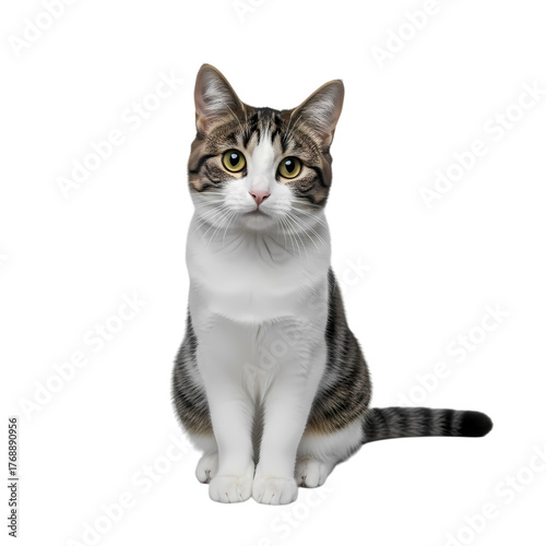 © shahzaib, Obraz premium Adorable tabby cat sitting attentively, perfect for pet-related marketing, animal lovers, and heartwarming content, capturing pure feline charm and endearing gaze