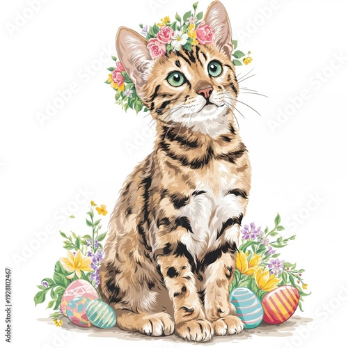 © Kubby_ph, Obraz premium Adorable Tabby Cat With Floral Crown and Colorful Easter Eggs in Spring Garden
