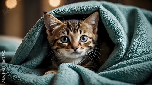 © Budiart, Obraz premium Adorable tabby kitten peeking from under a soft teal blanket, cozy and warm. Perfect for pet, comfort, and home themes.