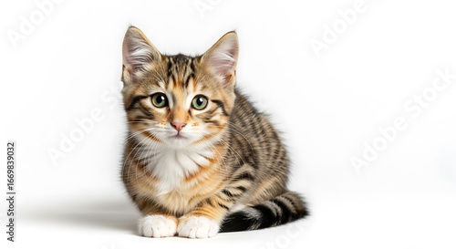 © SHAHELA, Obraz premium Adorable tabby kitten sitting and looking at the camera isolated on white background with a sweet expression on its face
