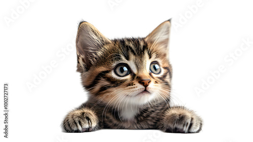 © Prasong Takham, Fototapeta premium Adorable Tabby Kitten Sitting and Looking Curiously in White Studio Background. Cute Young Domestic Cat Pet Portrait with Soft Fluffy Fur and Innocent Playful Expression.