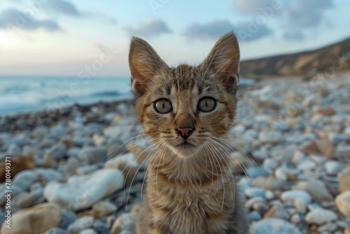 Obraz premium Adorable Tabby Kitten Standing on Pebble Beach with Waves in the Background...