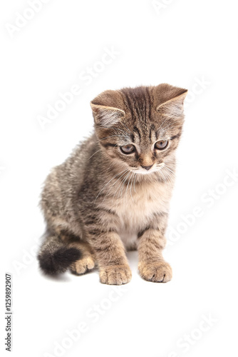 Fototapeta premium Adorable tabby kitten with fluffy fur and striped markings sits, looking down curiously. Isolated on a clean white background