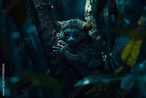 © BerkahStock, Obraz premium Adorable tarsier primate clinging to a tree trunk in a dark rainforest.