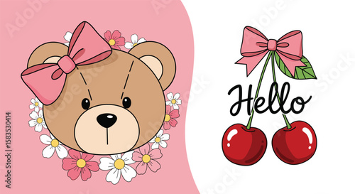 © Gen Max, Fototapeta premium Adorable teddy bear surrounded by flowers with cherries and hello text