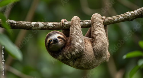 Fototapeta premium Adorable Three-Toed Sloth Hanging Upside Down on a Branch in Lush Green Rainforest
