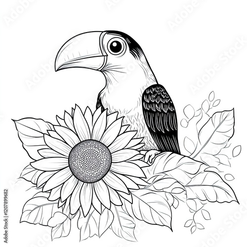 Naklejka premium Adorable Toucan and Sunflower Coloring Book Page for Kids