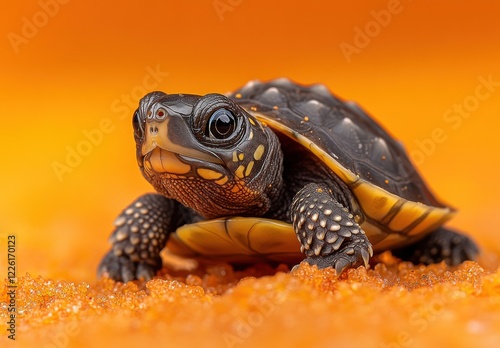 © ANUAR, Obraz premium Adorable turtle with intricate patterns and vibrant colors crawling on textured surface of orange hue, showcasing nature's beauty and wildlife charm