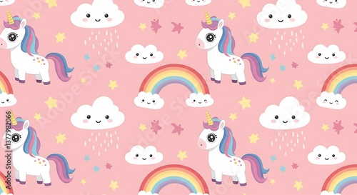 Fototapeta premium Adorable Unicorns Rainbow Dreams Pastel Pink Pattern AI Generated