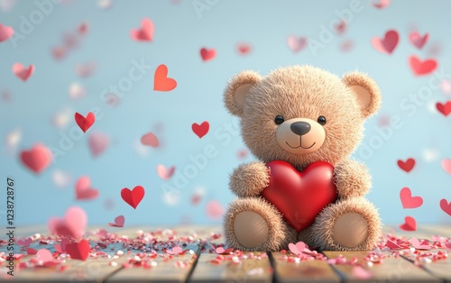 Obraz premium Adorable Valentines Day teddy bear holding a heart, surrounded by floating...