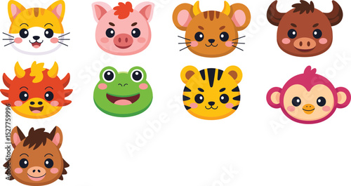 © Creative Asif, Naklejka premium Adorable Vector Illustration of Cartoon Animal Faces Featuring Cats, Pigs, Frogs, and More, Perfect for Kids' Design Projects