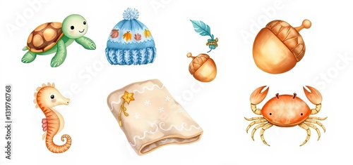 © Ahingska, Naklejka premium Adorable Watercolor Animals Autumn Elements Cute Sea Creatures Winter Hat Acrons Blanket
