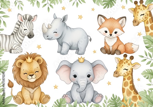 © Manok Mas, Naklejka premium Adorable Watercolor Baby Safari Animals Collection with Jungle Leaves and Golden Stars for Children