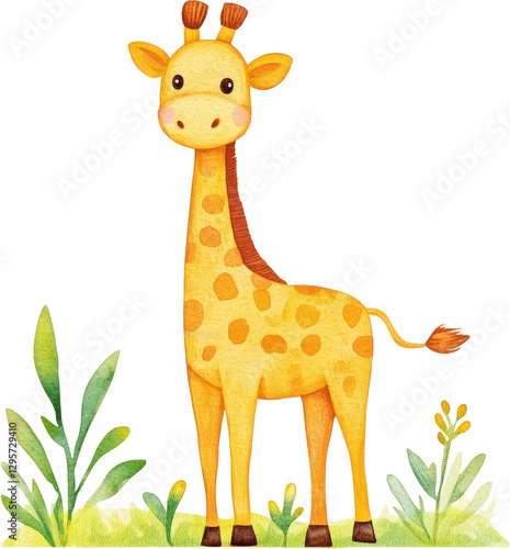 Fototapeta premium Adorable Watercolor Giraffe Illustration Standing in Grassland Perfect for Kids Books and Designs