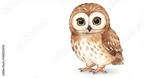 © KomandanSayur, Naklejka premium Adorable watercolor illustration of a cute owl with big eyes on white background perfect for children's book, greeting card, nursery art and educational materials