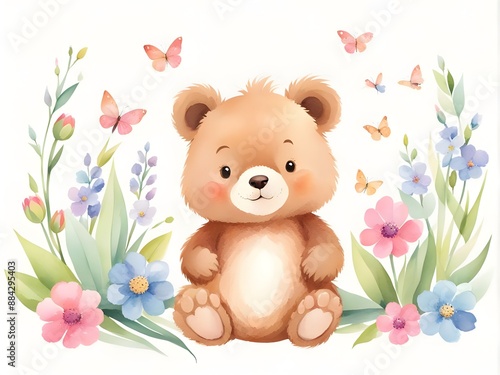 © Aodsy, Obraz premium Adorable watercolor illustration of a teddy bear surrounded by colorful spring flowers and butterflies, creating a whimsical and joyful scene.