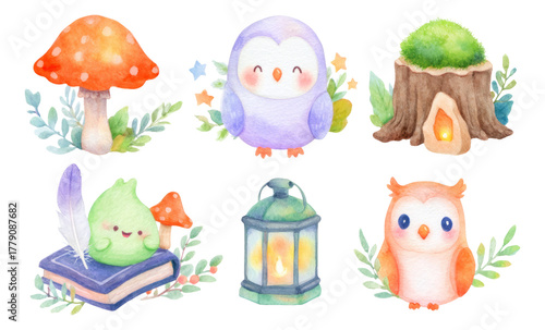 Naklejka premium Adorable Watercolor Illustrations of Forest Animals and Nature Elements Isolated