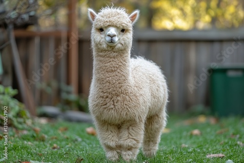 © Michael, Fototapeta premium Adorable white alpaca standing on grass in front of wooden fence