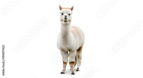 Fototapeta premium Adorable white alpaca with soft, fluffy fur standing upright, looking directly at the viewer with a gentle expression on a clean white studio background