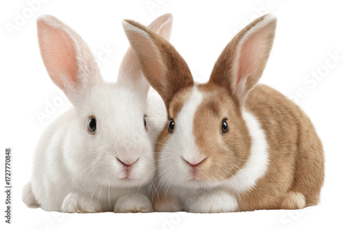 Obraz premium Adorable white and brown rabbits snuggling close together, cut out
