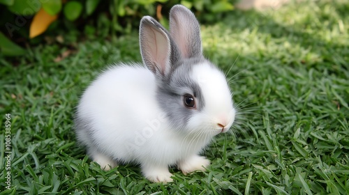 Fototapeta premium Adorable white and grey bunny rabbit with pink nose sitting in green grass.