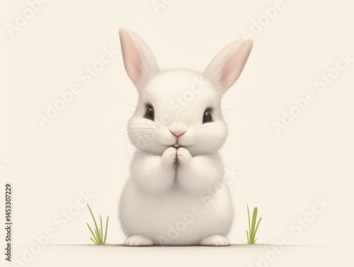 © Nonot, Obraz premium Adorable white bunny sitting upright with paws together on a pastel background