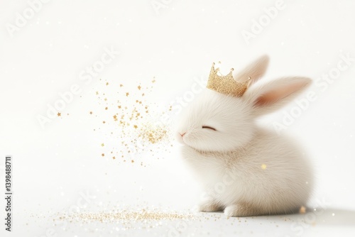 Fototapeta premium Adorable white bunny wearing a golden crown, exhaling golden glitter stars.