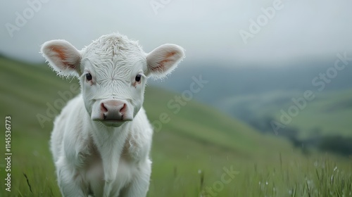 Obraz premium Adorable White Calf in Green Pastoral Landscape