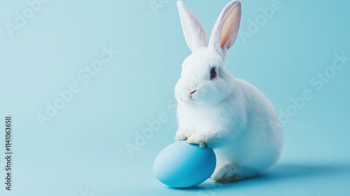 Fototapeta premium Adorable White Easter Bunny with a Light Blue Egg