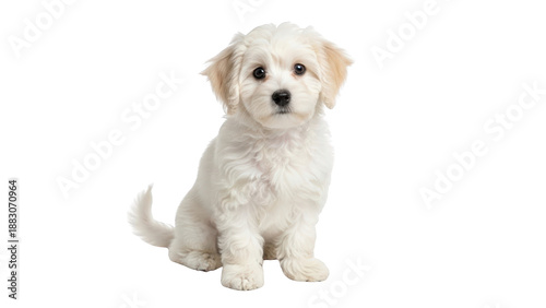Obraz premium Adorable white fluffy puppy sitting on a clean white background.