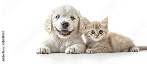 © nasira, Obraz premium Adorable white golden retriever puppy and a beige kitten, full-body portrait with smiling faces, their detailed fur texture isolated against a bright white backdrop.