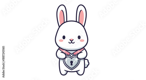 Obraz premium Adorable white kawaii rabbit character holding a heart-shaped padlock.
