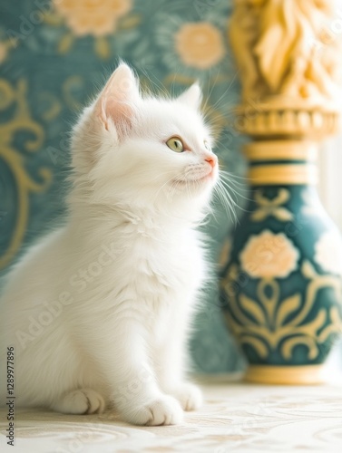 © Narongsag, Fototapeta premium Adorable White Kitten on Windowsill with Roses and Parisian Castle View