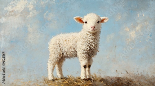 Fototapeta premium Adorable White Lamb Standing in a Field