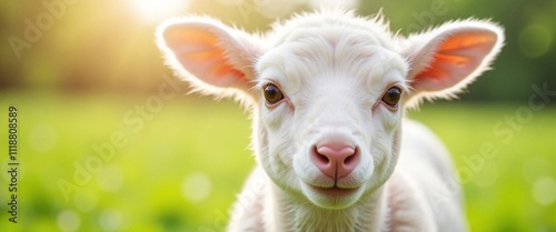 © Yury, Fototapeta premium Adorable white lamb with curious expression grazing in sunny meadow